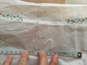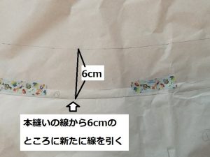 ウエスト部分のぬいしろを6cmにするため、本縫い線のところから6cmのところに線を引きます。