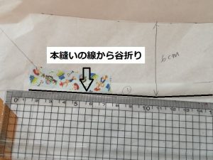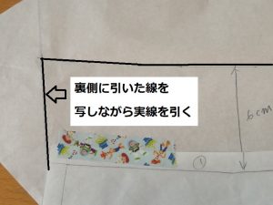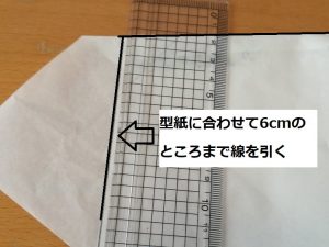 谷折りを元に戻し、ぬいしろ6cm伸ばしたところとつながるように線を引きます。